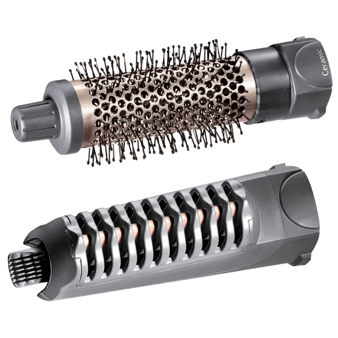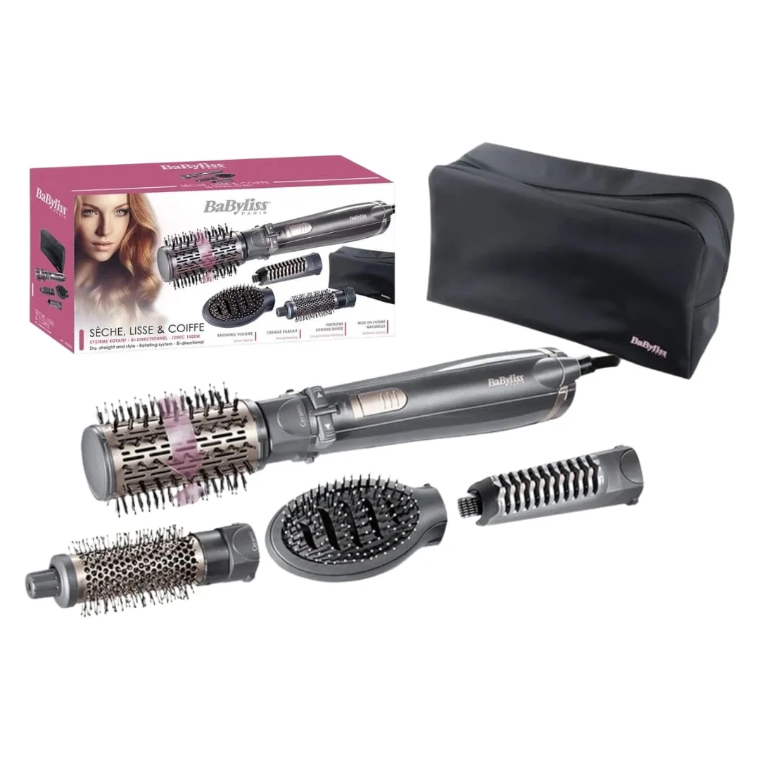 این سشوار با توان مصرفی ۱۰۰۰ وات و موتور DC کارکرد مناسبی ارائه میدهد. کابل ۱.۸ متری چرخان به کاربر آزادی عمل بیشتری میدهد و وزن سبک ۴۲۵ گرمی سشوار تجربه کار طولانی بدون خستگی را فراهم میکند. وجود قابلیت چرخش دوطرفه برس باعث ایجاد حالت طبیعی در مو میشود. برس پارویی دستگاه جهت گره زدایی به کار رفته و اتصال صاف کننده آن برای استفاده روی موهای طبیعی بسیار کاربردی است. فناوری تولید یون در این سشوار چرخشی بابلیس سبب حذف الکتریسیته ساکن شده و در نهایت موهای براق و خوش حالتی ایجاد میکند.